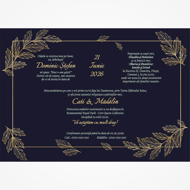 Design sofisticat pe fundal bleumarin intens, cu accente aurii și elemente vegetale stilizate, ideal pentru un eveniment elegant organizat seara.