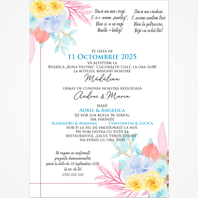 Potrivită pentru evenimente de tip „2 în 1” – nuntă și botez –, această invitație combină armonios detalii delicate cu un aer festiv, fiind ideală pentru familiile care își sărbătoresc dragostea și copilul în aceeași zi.