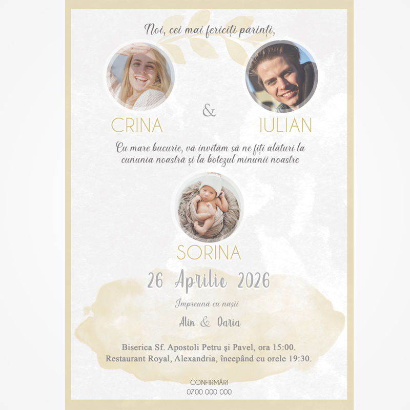 Cu accente aurii și un fundal texturat, invitația are un aer calm și elegant.