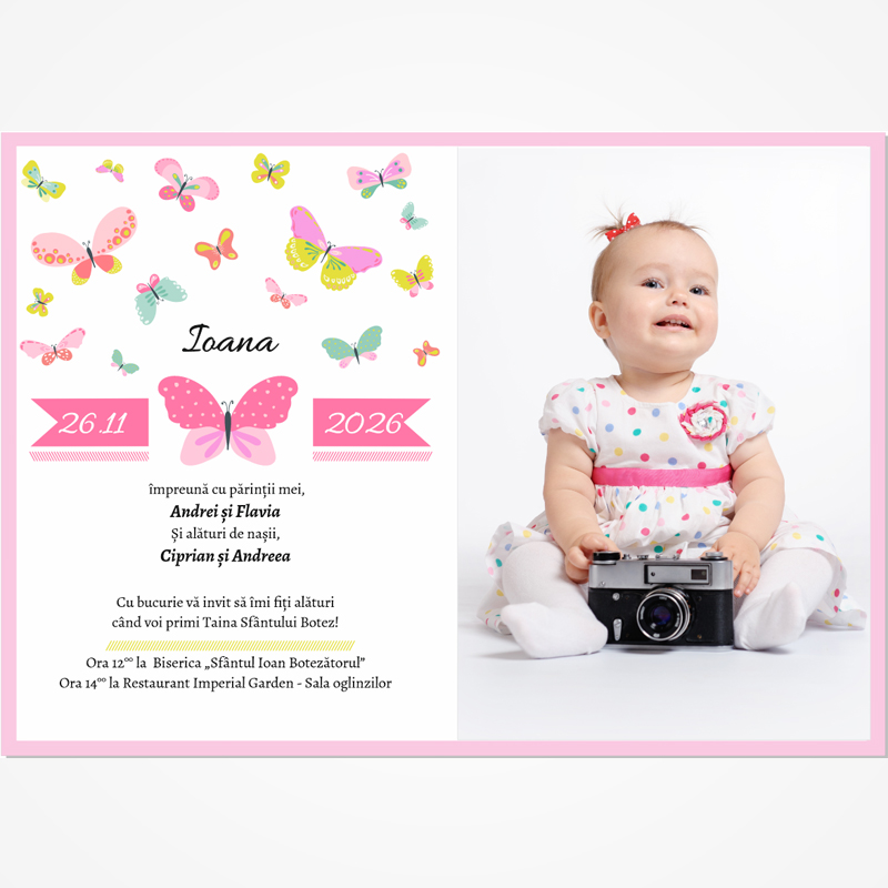 Invitație digitală pentru botez „Fluturi și zâmbete” LI-B003