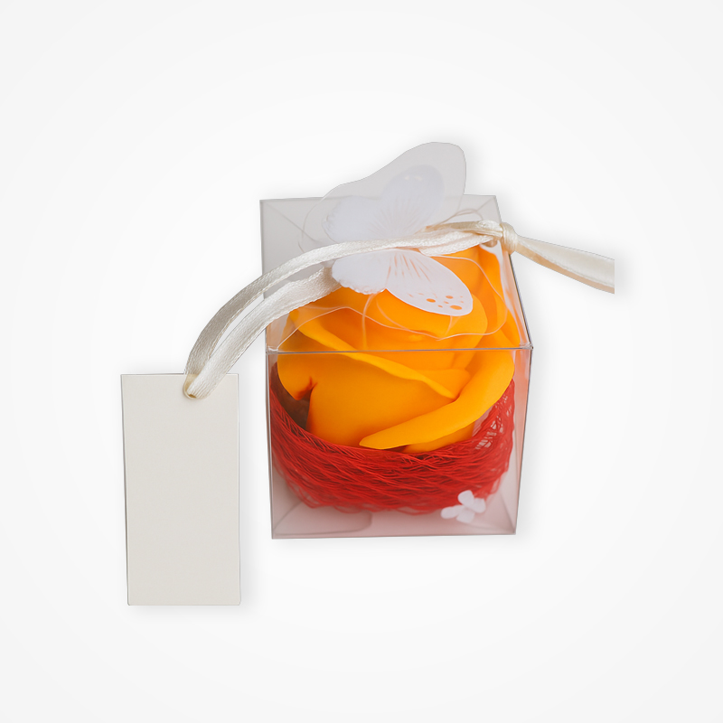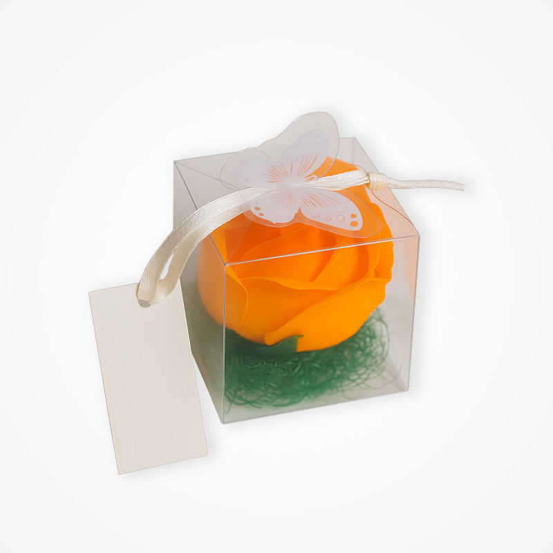 O amintire stilată și plină de simbolism! Această mărturie conține un trandafir de săpun delicat, în nuanța portocaliu, așezat delicat pe un pat de fibră decorativă sau sizal, disponibil în mai multe variante.