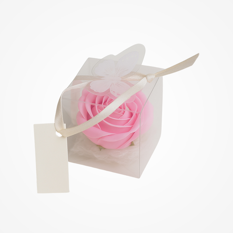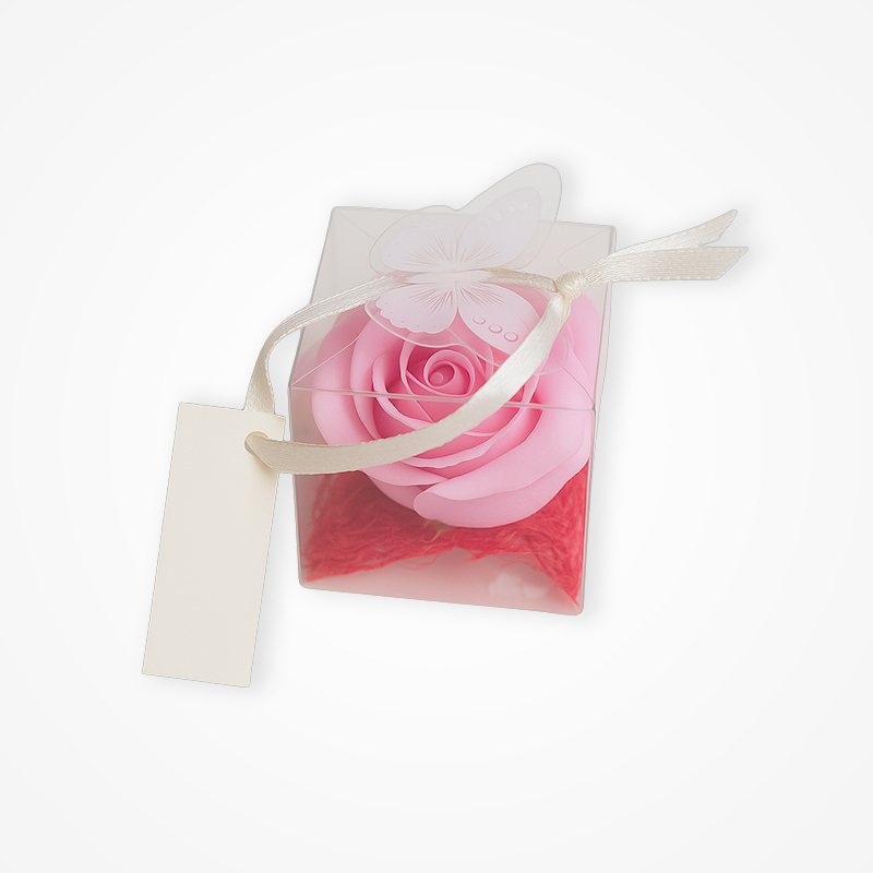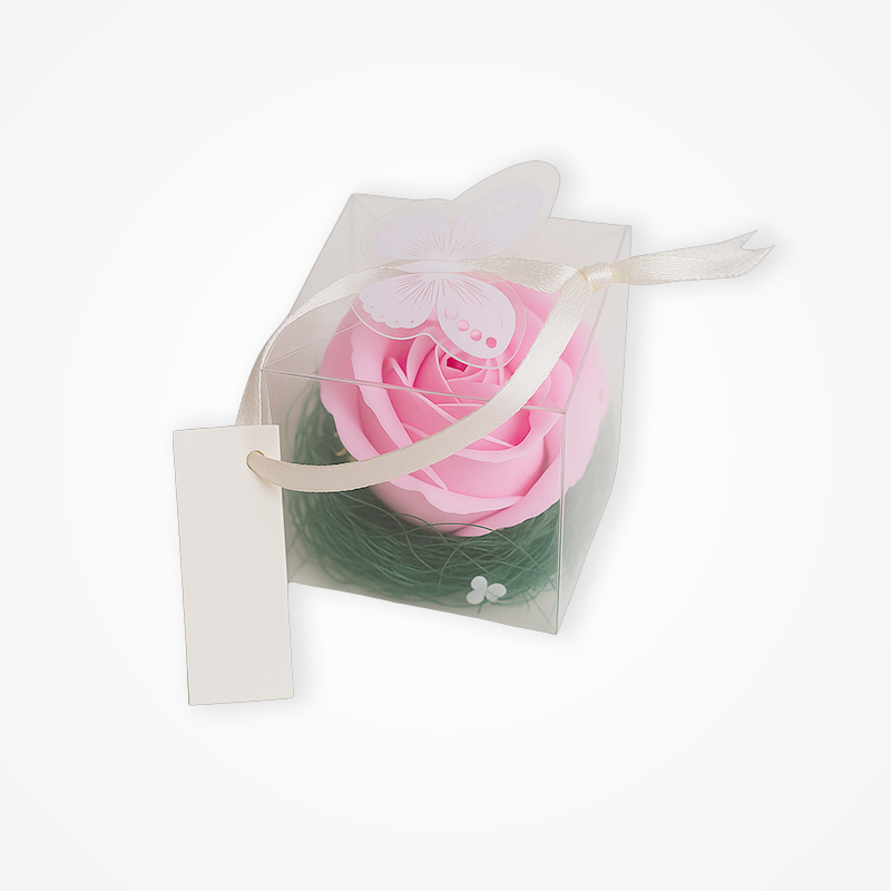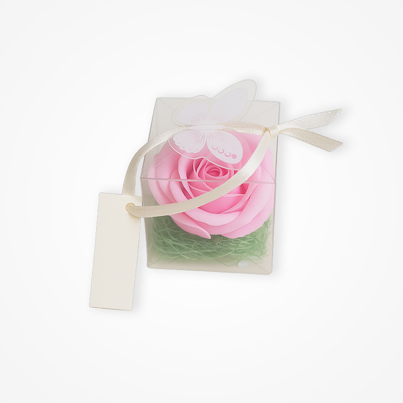O amintire stilată și plină de simbolism! Această mărturie conține un trandafir de săpun delicat, în nuanța roz, așezat delicat pe un pat de fibră decorativă sau sizal, disponibil în mai multe variante.