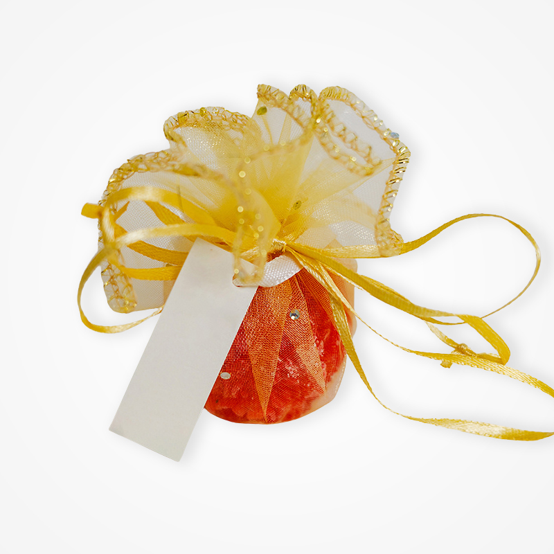 Ambalaj: săculeț crem sau auriu din tul cu bordură aurie și panglică satinată;